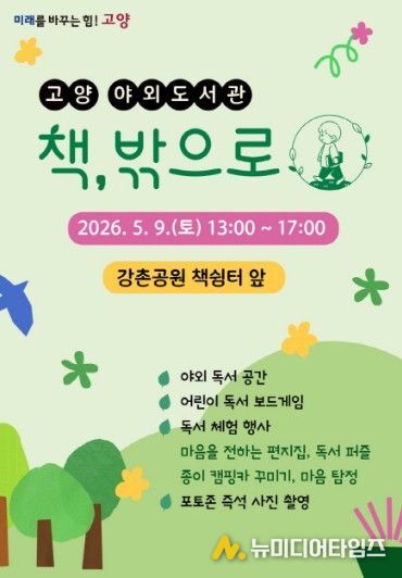 고양특례시는 오는 5월 9일 오후 1시부터 5시까지 일산동구 강촌공원 책쉼터 앞에서 고양 야외도서관 ‘책, 밖으로’를 운영한다.