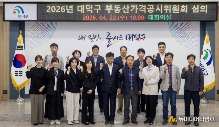 ![최충규 대덕구청장(사진 첫 번째 줄 가운데)과 부동산가격공시위원 및 관계자들이 22일 심의를 진행하기에 앞서 파이팅을 외치며 기념 촬영을 하고 있다.]](/data/photos/portnews/202604/20260422140045-28176.jpg)