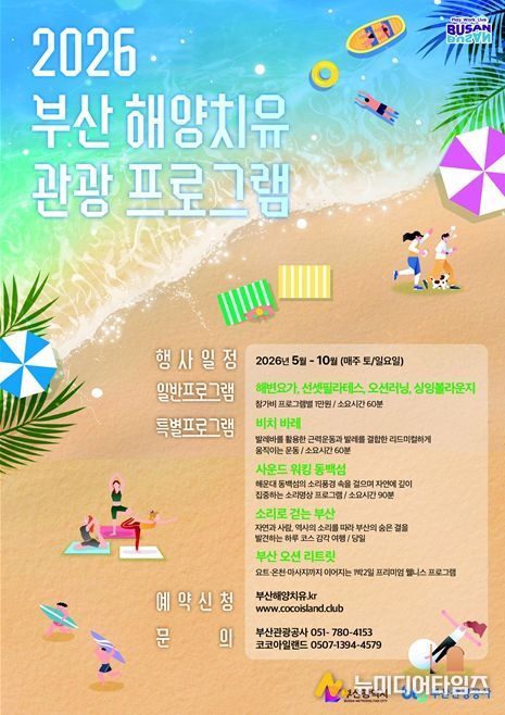 부산시는 오는 5월 1일부터 10월까지 매주 토·일요일에 부산의 7개 해수욕장(해운대, 송정, 광안리, 송도, 다대포, 일광, 임랑)과 동백섬 일원에서 '2026 해양치유 관광 프로그램'을 운영한다고 밝혔다.