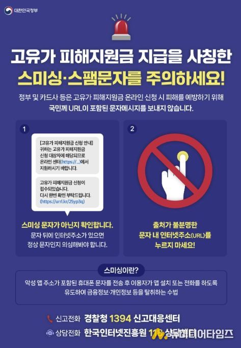 시에 따르면 정부 및 카드사 등 공식 기관은 지원금 신청과 관련해 링크(URL)가 포함된 문자를 발송하지 않는다. 다만, 1차 신청률 제고를 위해 1차 지원 대상자를 대상으로 URL이 포함되지 않은 안내 문자를 발송할 예정이다.