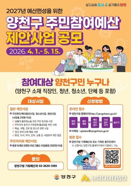 양천구는 2027년 예산 편성 과정에 구민의 목소리를 반영하기 위해 ‘주민참여예산 제안사업’ 공모를 오는 5월 15일까지 진행한다고 밝혔다.