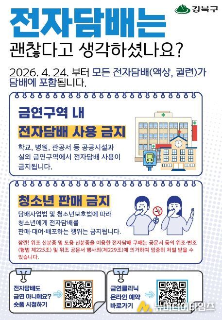 이순희 강북구청장은 “전자담배 역시 금연구역에서 사용할 수 없는 대상이라는 점을 분명히 알리고, 청소년 보호와 간접흡연 예방을 위해 법령 준수가 필요하다”며 “앞으로도 금연 환경 조성과 구민 건강 증진을 위한 정책을 지속적으로 추진하겠다”고 말했다.