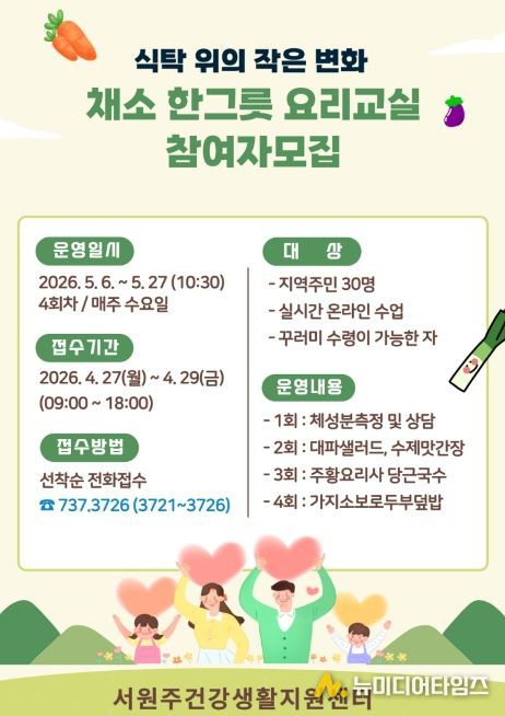 서원주건강생활지원센터는 증가하는 만성질환에 대응하기 위한 ‘식탁 위의 작은 변화, 채소 한그릇 요리교실’ 프로그램 참여자를 모집한다.