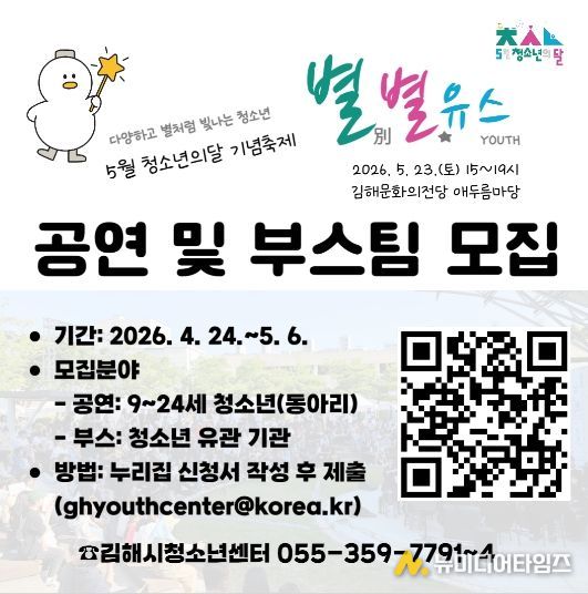 김해시청소년센터는 청소년이 직접 기획하고 참여하는 2026년 청소년의 달 기념 축제 ‘별별유스’를 앞두고 공연 및 체험 부스 참가팀 모집에 나섰다고 밝혔다.