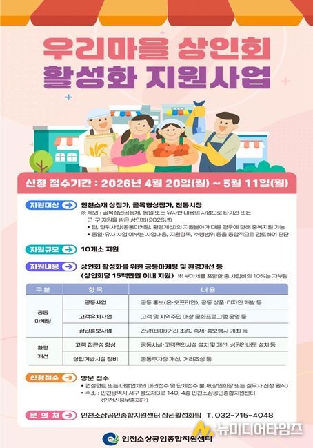 인천광역시는 지역 상권의 자생력 강화와 골목경제 활성화를 위해 ‘2026년 우리마을 상인회 활성화 지원사업’을 본격 추진한다고 밝혔다.