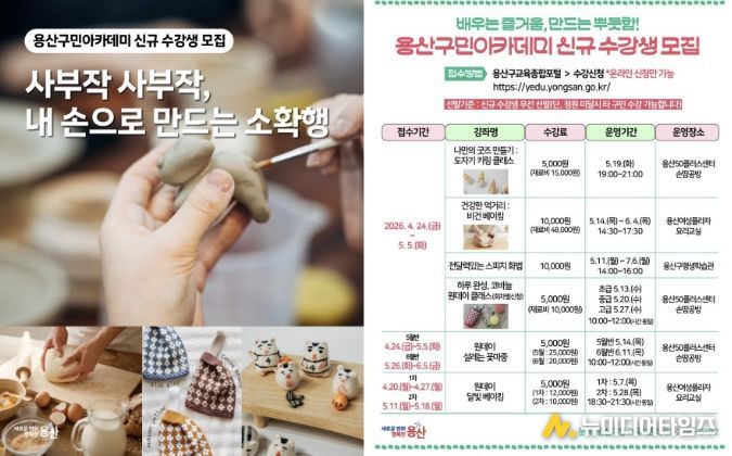 ‘용산구민아카데미 2기’는 도자기, 코바늘 등 다양한 분야의 강좌로 구성됐다. 특히 구민들이 일상에서 바로 활용할 수 있도록 체험 중심 프로그램을 강화하고, 단기 체험형 일일 강좌와 정규 강좌를 함께 운영해 다양한 학습 수요를 반영한 점이 특징이다.