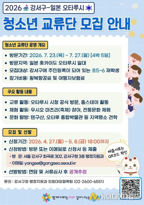모집 대상은 강서구에 주민등록이 되어 있고, 해외여행이 가능한 초등학교 5~6학년 학생 10명이다. 도시 간 상호 교류를 위해 참가 학생들은 2027년 오타루시 청소년 교류단이 구를 방문할 때 홈스테이를 제공하고 함께 활동에 참여해야 한다.