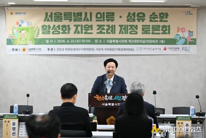 서울시의회 이민옥 의원(성동3, 더불어민주당)은 4월 22일 오전 10시 서울시의회 제2대회의실에서 임만균 환경수자원위원회 위원장, 사단법인 다시입다연구소와 공동으로 '서울특별시 의류·섬유 순환 활성화 지원 조례 제정 토론회'를 개최했다.