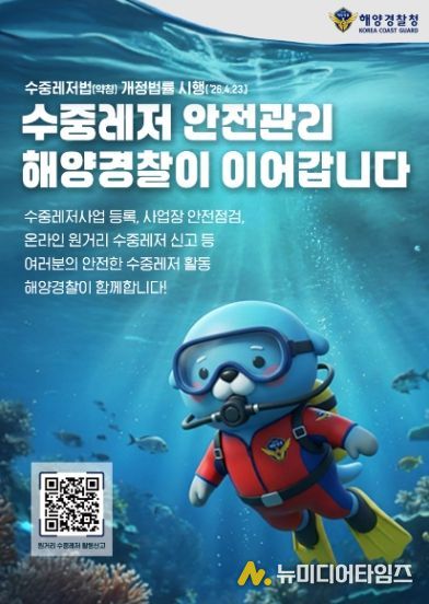 중부지방해양경찰청은 「수중레저활동의 안전 및 활성화 등에 관한 법률」(약칭. 수중레저법)을 시행(4.23.)하며 수중레저 안전관리를 강화한다고 밝혔다.