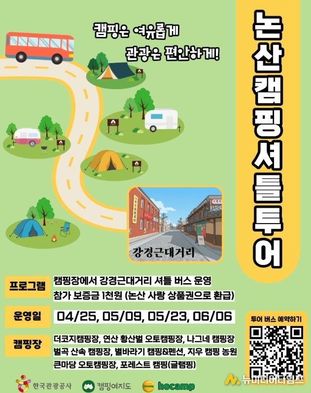 ‘논산 캠핑 셔틀버스’프로그램은 한국관광공사 대전·충남지사와 함께 운영되며, 총 8개 캠핑장을 2개의 노선으로 순환해 강경근대거리까지 왕복 운행한다.