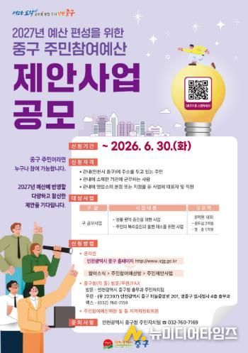 인천시 중구는 ‘2027년도 예산편성을 위한 주민참여예산 제안사업 공모’를 추진한다고 23일 밝혔다.