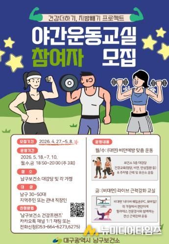 대구 남구는 오는 5월부터 관내 직장인과 주민의 비만 예방 및 신체활동 활성화를 위한 ‘건강 더하기 지방빼기 프로젝트! 2026년 야간운동교실’을 운영한다고 밝혔다.
