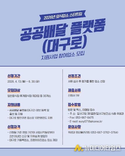 대구 달서구는 신규 외식업소의 조기 정착과 경영 안정화를 돕기 위해 ‘2026년 외식업소 스타트업 공공배달 플랫폼 지원사업’을 추진한다.