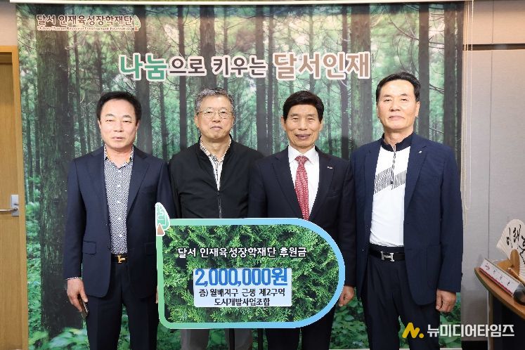 대구 달서구는 월배지구 근생 제2구역 도시개발사업조합(조합장 김희동)으로부터 지역 인재육성을 위한 장학금 200만 원을 (재)달서인재육성장학재단에 기탁받았다고 23일 밝혔다.