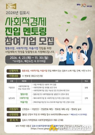 김포시는 협동조합, 사회적기업, 마을기업 등 사회적경제기업 진입을 지원하기 위해 ‘2026년 김포시 사회적경제 진입 멘토링’ 참여기업을 오는 11월 30일까지 수시 모집한다.