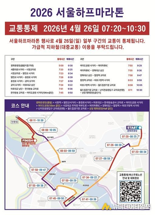 서울시는 4월 26일 오전 7시 30분 광화문광장을 출발해 여의도공원과 상암 월드컵공원으로 이어지는 ‘2026 서울하프마라톤대회’를 개최한다.