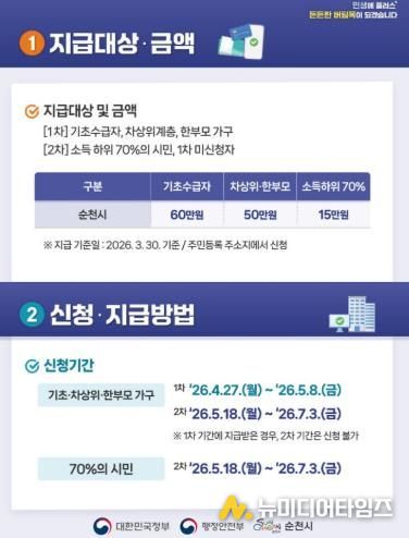 지급 대상은 올해 3월 30일 기준으로 순천시에 주민등록이 되어 있는 시민으로, 성인(2007년 12월 31일 이전 출생자)은 개인별 신청이 가능하며 미성년자(2008년 1월 1일 이후 출생자)는 주민등록상 세대주가 신청할 수 있다.