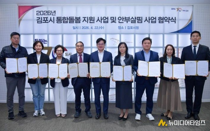김포시가 일상생활 서비스 제공기관 6개소, 관내 종합 병원 2개소, 김포시 우체국과 함께 김포시 통합돌봄사업 및 안부살핌 사업 추진을 위한 업무협약을 22일 체결했다. 이번 업무협약은 '돌봄통합지원법'시행에 발맞춰 돌봄이 필요한 65세 이상 노인을 대상으로 시행하는 것으로, 가사·식사 지원, 목욕 및 이동 등 생활에 필수적인 서비스부터 고립 예방까지 체계적 지원이 이뤄질 것으로 기대된다.