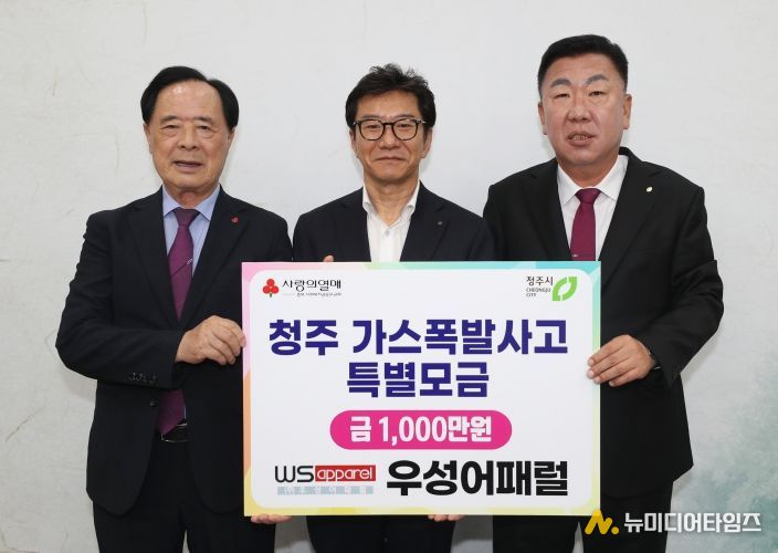 23일 ㈜우성어패럴은 청주시청을 방문해 봉명동 상가 가스폭발 사고로 피해를 입은 주민들을 돕기 위해 성금 1,000만원을 충북사회복지공동모금회를 통해 기탁했다.