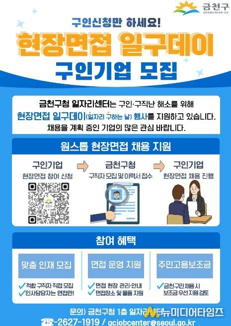 금천구는 구인·구직난을 해소하고, 기업의 원활한 채용을 지원하기 위해 ‘현장면접 일구데이’ 참여 기업을 상시 모집한다고 밝혔다.