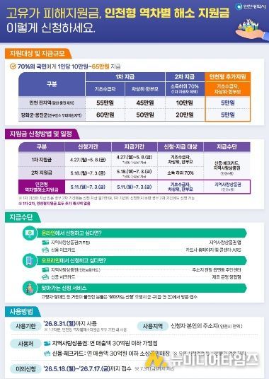이와 함께 지역 간 지원 격차를 보완하기 위한 ‘인천형 역차별 해소 지원금’ 5만 원도 5월 11일부터 취약계층을 대상으로 추가 지급될 예정이다.