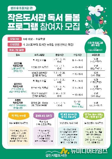 김천시립도서관(관장 이신기)에서는 지역 내 아이들에게 안전하고 유익한 돌봄 환경을 제공하기 위해 오는 5월부터 8월까지 ‘2026년 함께 키우는 작은도서관 돌봄사업’을 추진한다고 밝혔다.