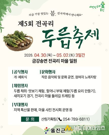 울진군 금강송면 전곡리에서 봄철 대표 산나물인 두릅을 주제로 한 ‘제5회 전곡리 두릅축제’가 오는 4월 30일부터 5월 2일까지 3일간 전곡리 마을 일원에서 개최한다.