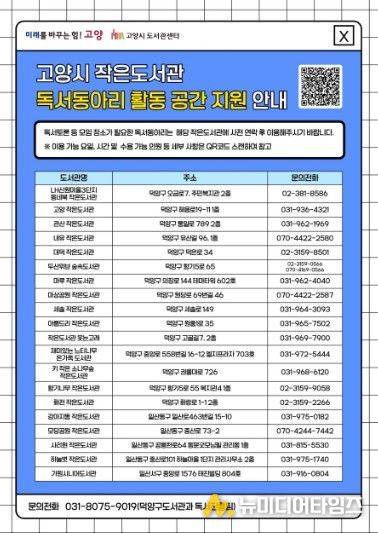 고양시 관계자는 “이번 공간 지원 사업이 독서동아리의 활동 기반을 넓히고, 작은도서관이 지역사회 내 커뮤니티 공간으로서 기능을 강화하는 계기가 되길 바란다”며, “앞으로도 시민들이 ‘함께 읽는 독서 문화’를 누릴 수 있도록 지원하겠다”고 말했다.
