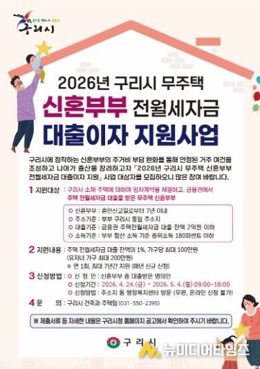 구리시는 관내 무주택 신혼부부의 주거비 부담을 완화하고 저출생 문제 극복에 이바지하기 위해 ‘2026년 2차 무주택 신혼부부 전월세 자금 대출이자 지원사업’을 오는 4월 24일부터 시행한다고 밝혔다.