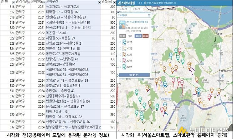 이에 관악구는 개방된 공공데이터와 현장 관리를 위해 내부적으로 작성한 도면 자료를 결합했다. 텍스트와 도면 데이터를 ‘서울스마트맵’상의 공간정보로 정밀하게 전환·구현함으로써, 이제는 누구나 도로열선의 구체적인 위치를 지도상에서 한눈에 확인할 수 있게 됐다.