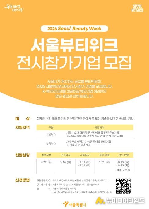 참여를 희망하는 기업은 5월 18일까지 구글 폼을 통해 신청할 수 있으며, 자세한 사항은 서울뷰티위크 공식 누리집 또는 서울시 누리집에서 확인할 수 있다.