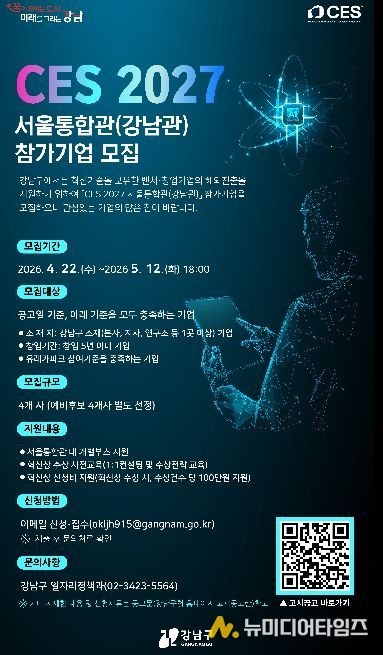 꿈이 모이는 도시, 미래를 그리는 강남구가 세계 최대 IT·전자 전시회인 CES 2027을 무대로 관내 스타트업의 글로벌 진출 지원에 나선다. 강남구는 ‘CES 2027 서울통합관(강남관)’에 참여할 스타트업을 4월 22일부터 5월 12일까지 모집한다.