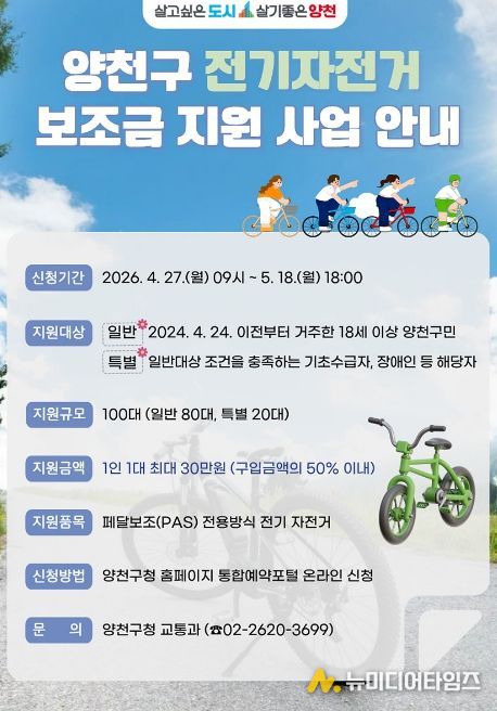 양천구는 탄소중립 실천과 구민의 이동 편의 증진을 위해 서울시 자치구 가운데 유일하게 시행 중인 ‘전기자전거 구입 보조금 지원사업’을 올해도 지속 추진한다고 27일 밝혔다.