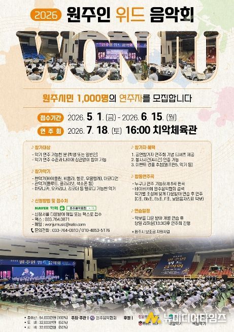(사)한국음악협회 원주지부는 오는 7월 18일 열리는 ‘2026 원주인 위드 음악회’에 참여할 시민 연주자 1,000명을 모집한다.
