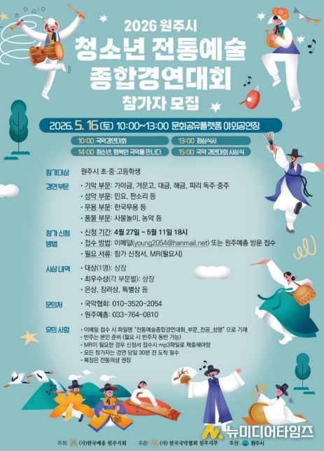 모집 부문은 ▲전통예술 종합경연대회 ▲청소년 트로트·가요·댄스 페스티벌 ▲원주청소년연극제 ▲학생음악콩쿠르 ▲치악산 전국 청소년 백일장 등 총 5개 분야다.