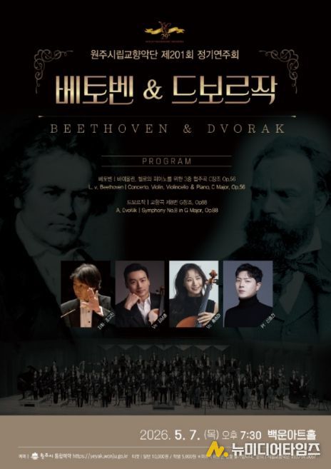 원주시립교향악단 제201회 정기연주회가 오는 5월 7일 오후 7시 30분 백운아트홀에서 개최된다. 이번 연주회에는 지휘자 조규진과 바이올리니스트 김남훈, 첼리스트 홍승아, 피아니스트 신효건이 협연자로 나서 베토벤 3중 협주곡 C장조와 드보르작 교향곡 제8번 G장조를 선보일 예정이다.
