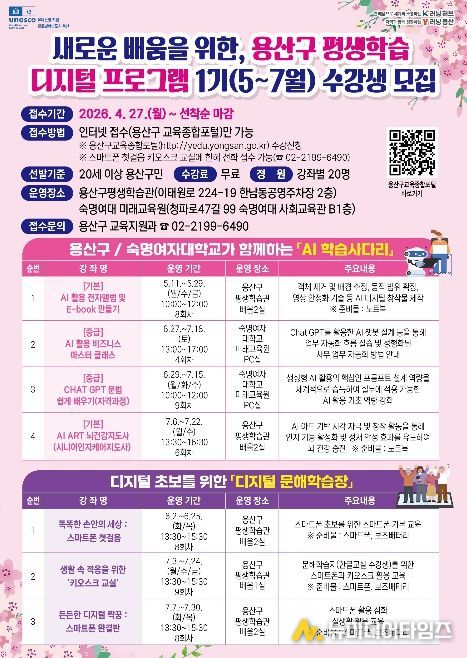 박희영 용산구청장은 “이번 공모사업 선정은 용산형 평생교육 정책의 의미 있는 성과이자, 지속 가능한 학습 도시로 도약하는 계기”라며, “앞으로도 구민 누구나 배움의 기회를 누릴 수 있도록 다양한 평생학습 기반을 확대해 나가겠다”라고 말했다.