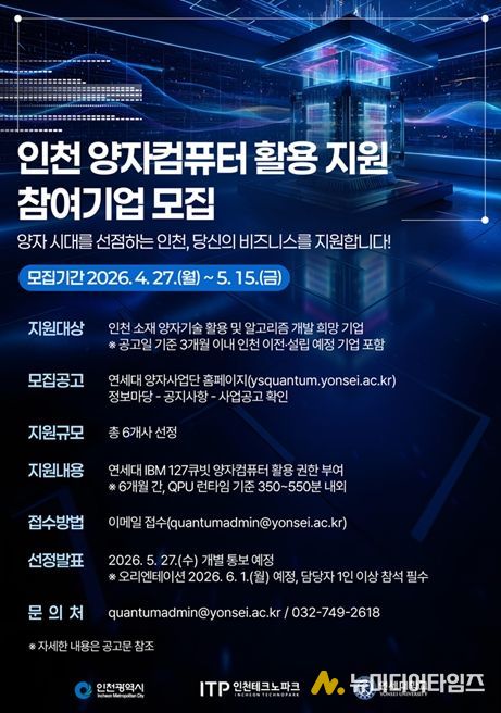 시는 연세대학교와 협력해 ‘2026년 인천 양자컴퓨터 활용 지원사업’에 참여할 기업을 모집한다.