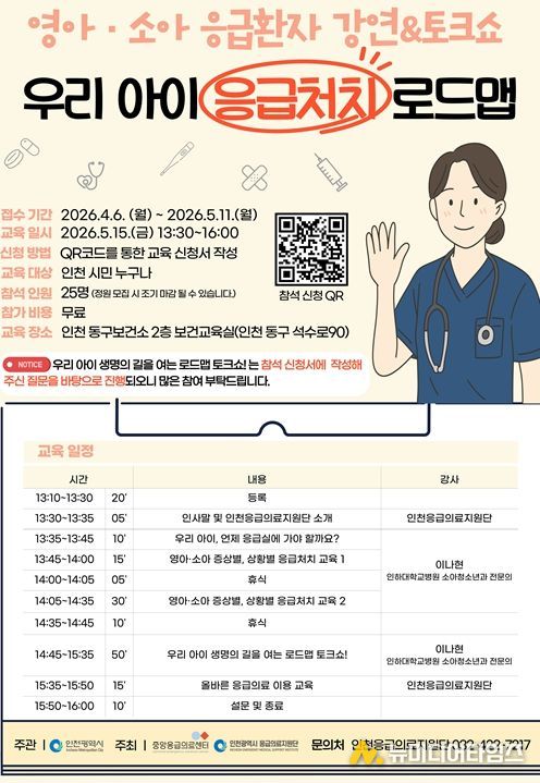 인천광역시는 영유아와 소아의 응급상황 발생 시 보호자의 신속하고 올바른 대응을 돕기 위해 응급처치 강연·토크쇼 ‘우리아이 응급처치 로드맵’을 오는 5월부터 12월까지 운영한다고 밝혔다.