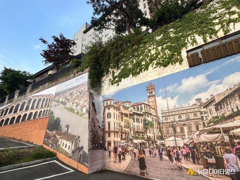 현장에 들어서면 가장 먼저 강렬한 색감의 입구와 대형 벽화가 시선을 사로잡는다. 입구 한편에는 ‘H. Santa Margherita’ 표식이 설치돼 있고, 주변 벽면에는 로미오와 줄리엣을 모티브로 한 이미지와 장면들이 이어지며 공간 전체에 하나의 서사를 부여하고 있다.