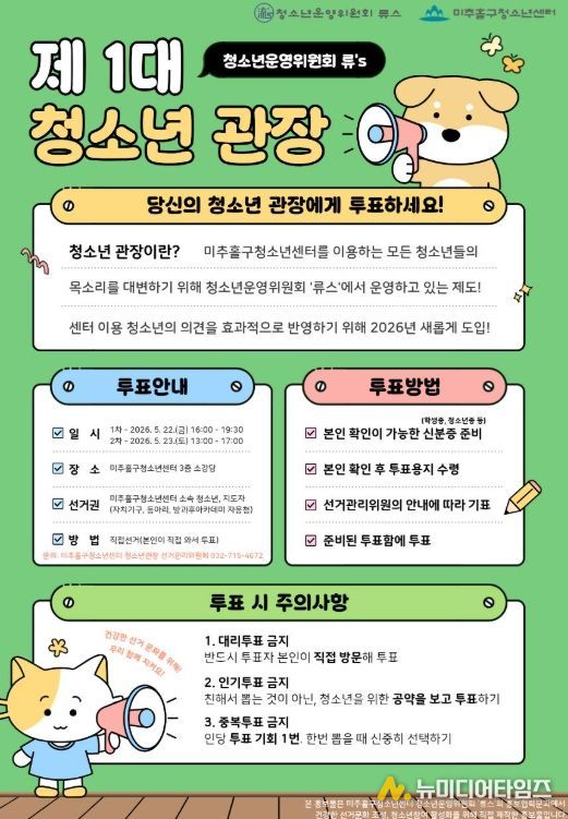 투표는 미추홀구청소년센터 3층 소강당에서 직접 투표 방식으로 이뤄지며, 1차 투표는 5월 22일 16:00~19:30, 2차 투표는 5월 23일 13:00~17:00에 각각 실시된다.
