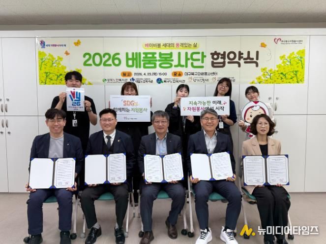 대구북구자원봉사센터는 지난 4월 23일, 관내 5개 노인복지관과 협력하여 은퇴 세대의 주도적 사회공헌 활성화를 위한 ‘베이비붐 세대의 품격있는 삶, 베품봉사단’ 공동 업무협약식을 진행했다.