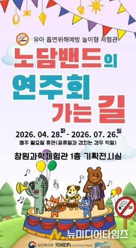 창원특례시 창원과학체험관은 오는 4월 28일부터 7월 26일까지 1층 기획전시실에서 유아 대상 흡연 예방 놀이형 특별전시 ‘노담밴드의 연주회 가는 길’을 개최한다.
