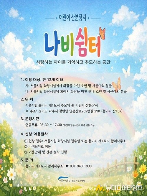 서울시는 5월 4일부터 용미리 제1묘지(경기도 파주시 소재) 추모의 숲 안에 약 500㎡ 규모 어린이 전용 산분장지 ‘나비쉼터’ 시범 운영에 들어간다고 밝혔다.