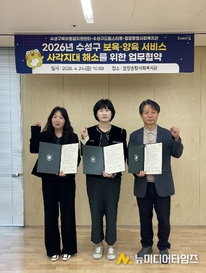 대구 수성구육아종합지원센터(센터장 심영숙)는 지난 24일 수성구 드림스타트센터(센터장 김은미), 함장종합사회복지관(관장 권혁철)과 지역 내 보육·양육 서비스 사각지대 해소를 위한 ‘3자 업무협약(MOU)’을 체결했다고 밝혔다.