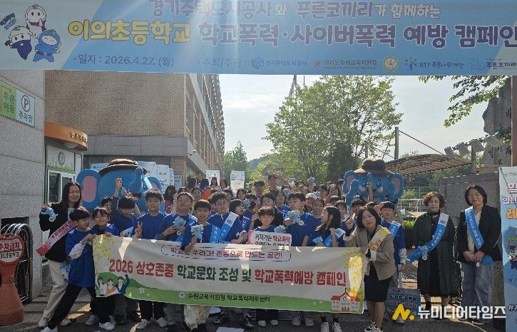 이번 캠페인은 최근 급증하는 청소년 사이버폭력 사안에 대응하고 건강한 디지털 시민 의식을 함양하기 위해 마련됐으며, 수원교육지원청을 비롯해 경기주택도시공사(GH), 푸른나무재단(푸른코끼리), 이의초 학부모회 관계자 등이 참여했다.