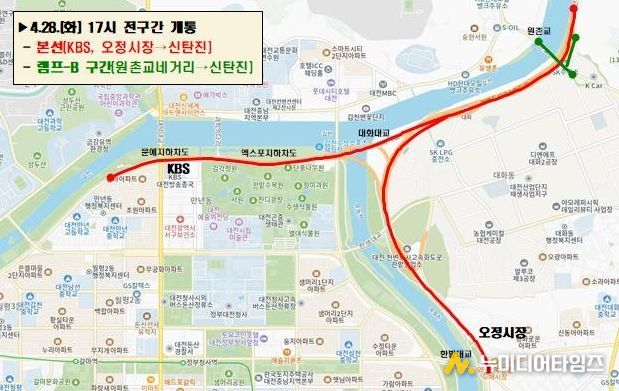 대전시는 원촌육교 일원 보강토옹벽 긴급 보수·보강 공사와 관련해, 지난 3월 30일 통제했던 천변도시고속화도로 본선 및 램프-B 구간을 4월 28일 오후 5시부터 전면 개통한다고 밝혔다.