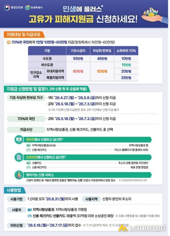 한편, 오는 5월 18일부터 7월 3일까지는 1차 지급대상을 제외한 소득 하위 70% 시민을 대상으로 2차 지원금의 신청·지급이 이어진다. 건강보험료를 활용한 세부 선정 기준(컷오프) 등 구체적인 사항은 5월 중 행정안전부의 별도 지침이 마련되는 대로 확정·안내할 예정이다.