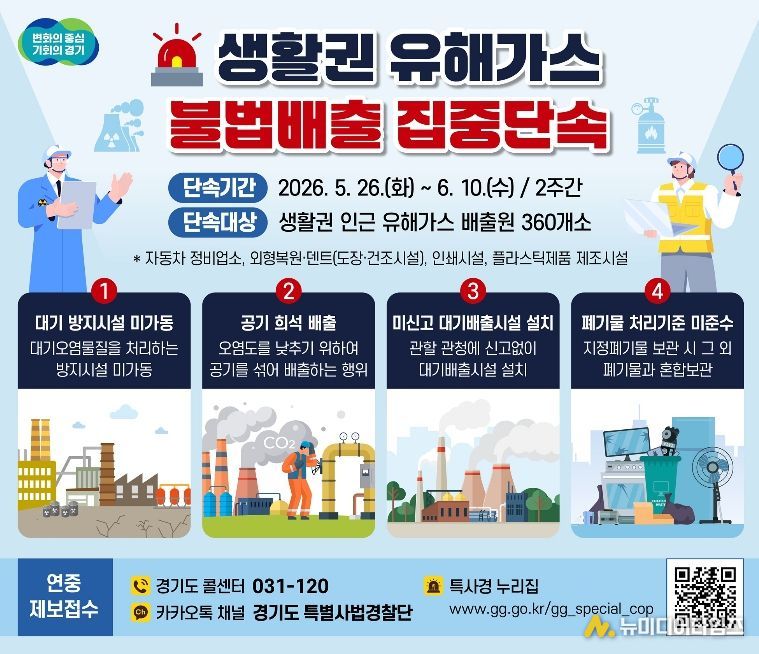 경기도 특별사법경찰단이 5월 26일부터 6월 10일까지 2주간 주거지·학교·병원 등 생활권 인근 지역의 유해가스 배출 사업장을 대상으로 불법행위를 집중단속 한다.