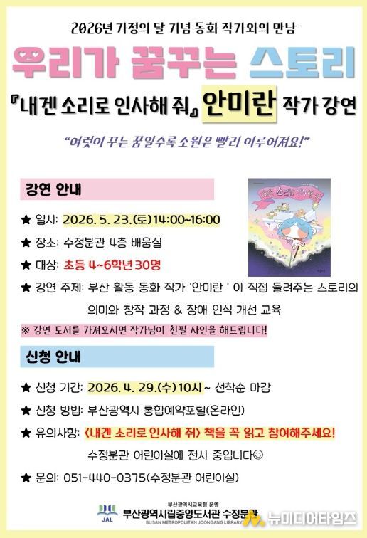 부산광역시립중앙도서관은 다음달 23일 중앙도서관 수정분관에서 초등학생 4~6학년 30명을 대상으로 가정의달 기념 안미란 동화 작가와의 만남 ‘우리가 꿈꾸는 스토리’를 운영한다.